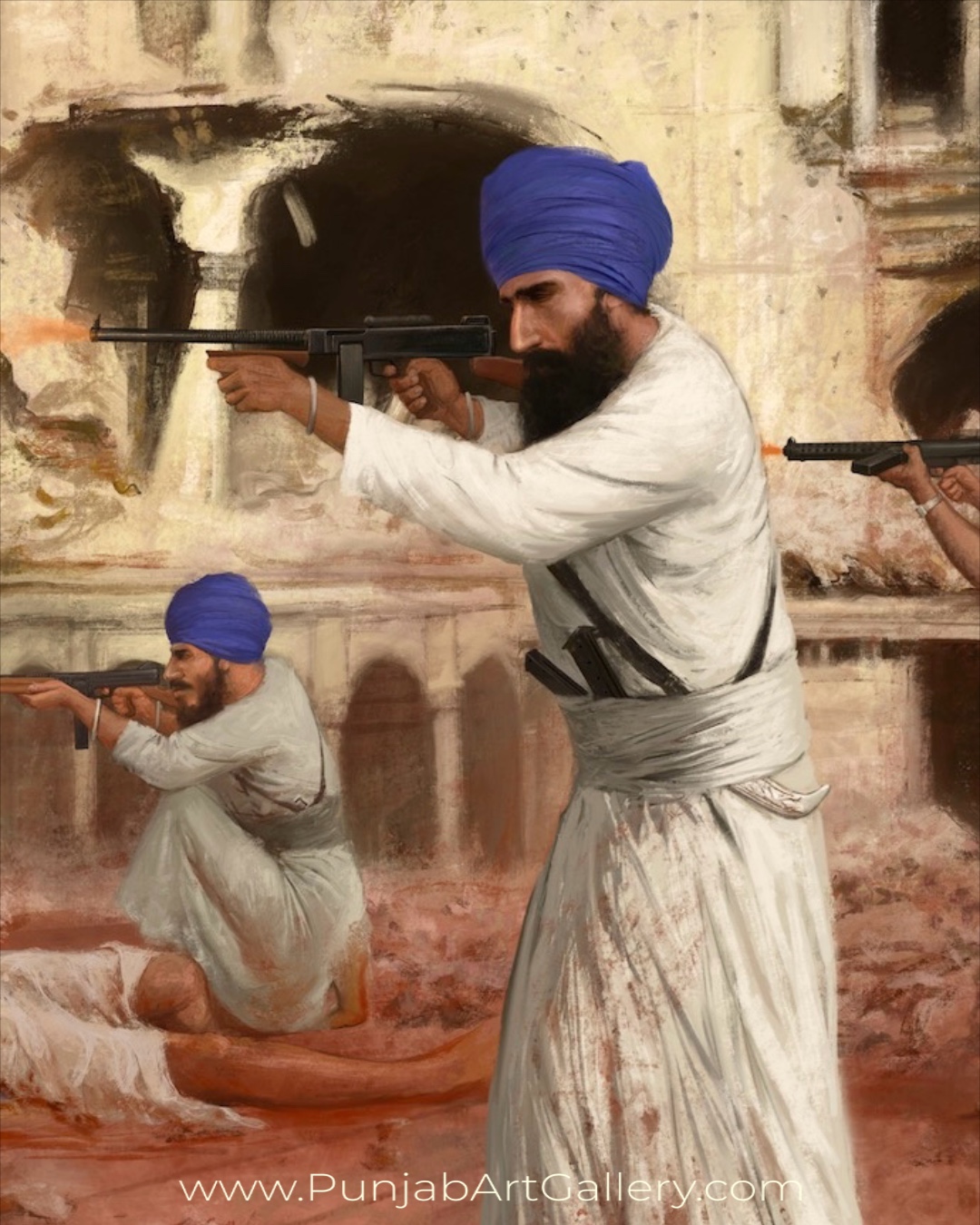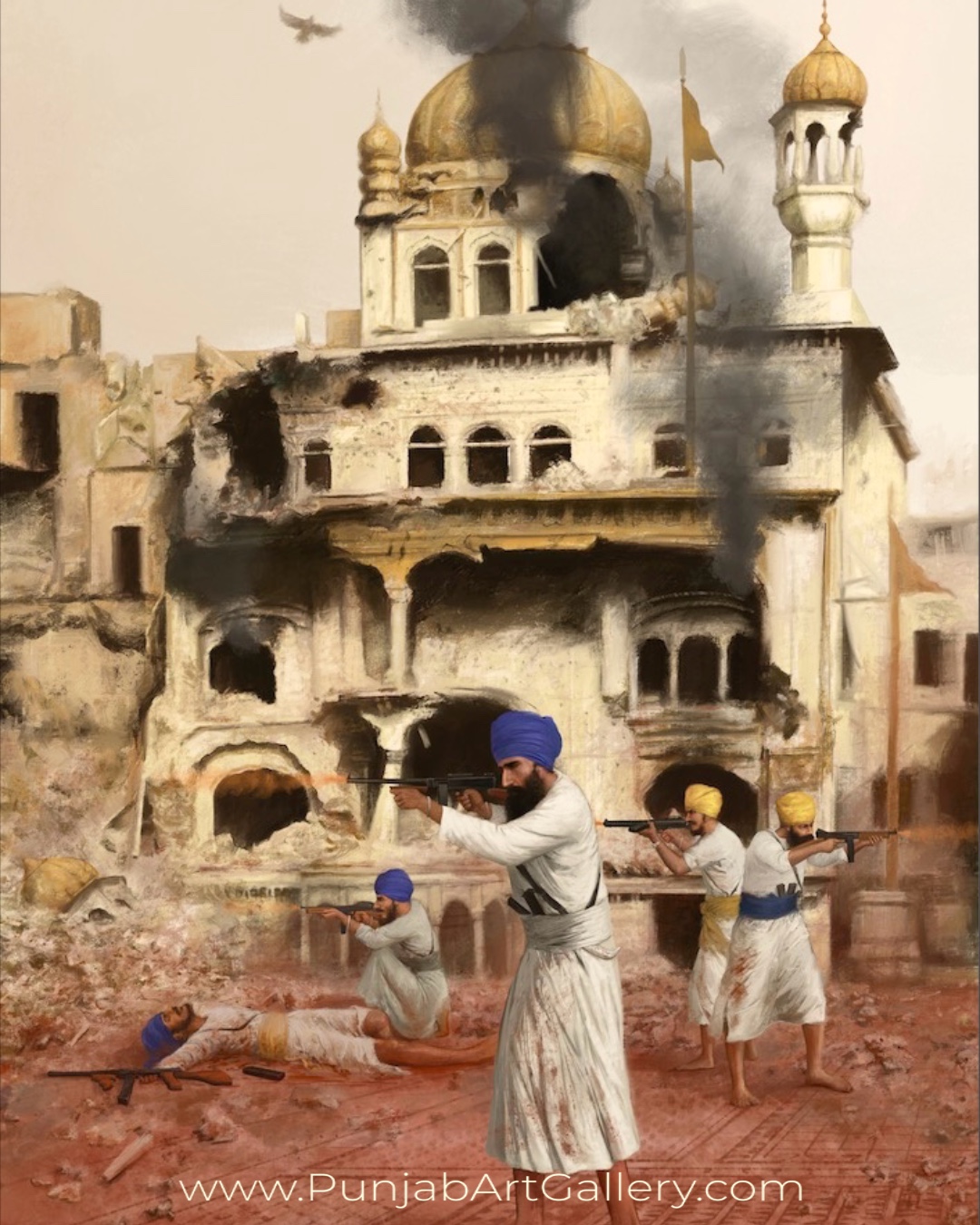 Set against a backdrop that symbolizes both peace and battle, the painting reflects the timeless principles of sabar (patience) and sidak (steadfast faith) that empower Sikhs to confront oppression. Each stroke of the brush is a tribute to the unwavering spirit of the shaheeds who restored justice by sacrificing their very being, reinforcing the natural order of life.