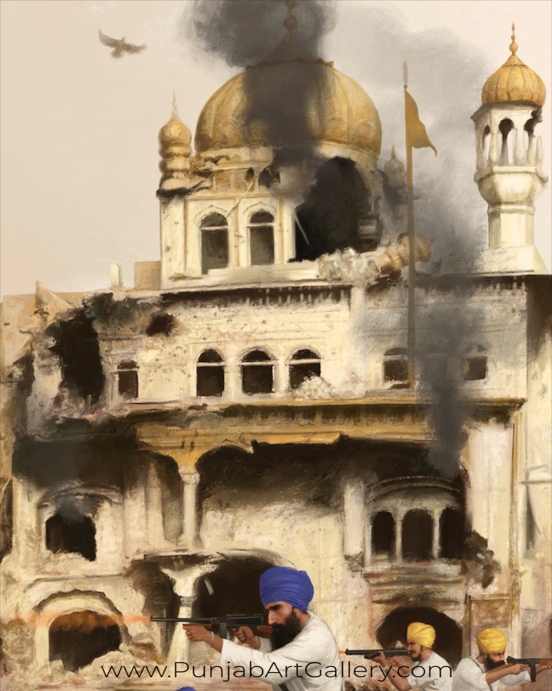The painting “ਸੰਤ ਜੀ ਤੇ ਸ਼ਹਾਦਤ – Sant ji and Shahadat” captures the profound legacy of martyrdom in Sikh history, beginning with the sacrifice of the Fifth Patshah, Sri Guru Arjan Dev Ji. Shahadat, one of the greatest blessings bestowed by Guru Sahib, represents the ultimate act of resistance against injustice and tyranny. This artwork beautifully illustrates the courage and perseverance of Sant Jarnail Singh Ji and countless other brave Singhs and Singhniyan, whose sacrifices continue to inspire and light the path towards justice.